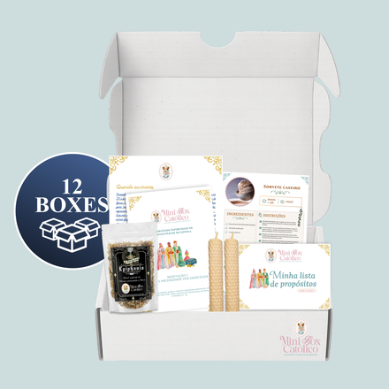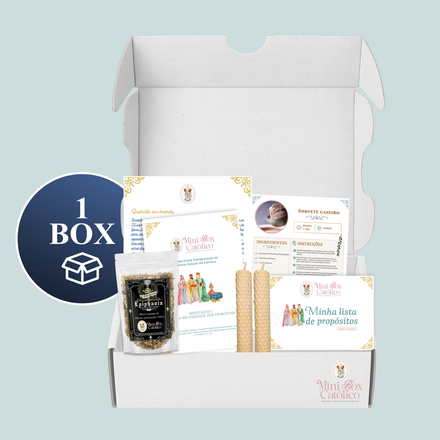A cada mês uma inspiração diferente! O Mini Box contém itens que irão te ajudar a fortalecer sua amizade com Deus. Nossas assinantes recebem todos os meses: 1 vela de cera de abelha, 1 oração, 1 exercício espiritual, 1 lista de propósitos e 1 receita.